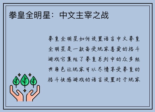 拳皇全明星如何设置语言中文 拳皇全明星是一款备受玩家喜爱的格斗游戏,它集结了拳皇系列中的众多经典角色,让玩家可以尽情享受拳皇的格斗快感。游戏的语言设置对于玩家来说非常重要,因为它直接影响到玩家对游戏的理解和操作。本文将从多个方面详细阐述拳皇全明星如何设置语言中文。 1. 游戏界面和菜单 拳皇全明星的游戏界面和菜单是玩家接触游戏的第一步,因此语言设置对于玩家来说至关重要。游戏应该提供中文界面和菜单选...